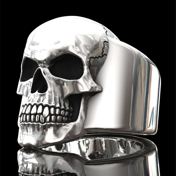 An evil skull on a plain band. Handmade in sterling silver with London assay office hallmarks.